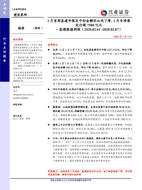 【兴业证券】【20200209】2月首周基建申报及中标金额环比均下滑,1月专项债发行超7500亿元-20页 行业研究