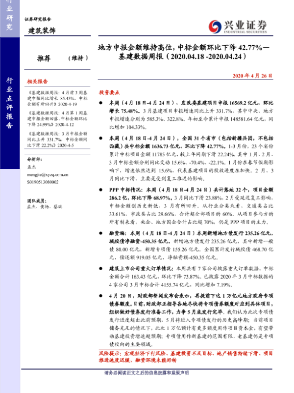 【兴业证券】【20200426】地方申报金额维持高位,中标金额环比下降42.77%—基建数据周报-23页 行业研究