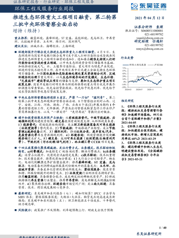 【东吴证券】【20210412】环保工程及服务行业周报:推进生态环保重大工程项目融资,第二轮第三批中央环保督察全面启动-40页 行业研究