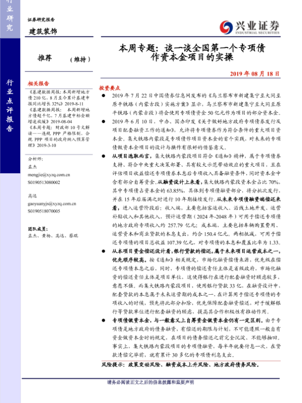 【兴业证券】【20190818】全国第一个专项债作资本金项目的实操-5页 行业研究