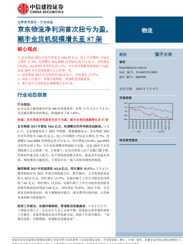 【中信建投证券】【20240309】物流行业:京东物流净利润首次扭亏为盈,顺丰全货机规模增长至87架-25页 行业研究