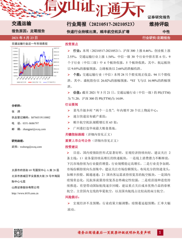 【山西证券】【20210523】交通运输行业周报:快递行业持续出清,顺丰航空机队扩增-14页 行业研究