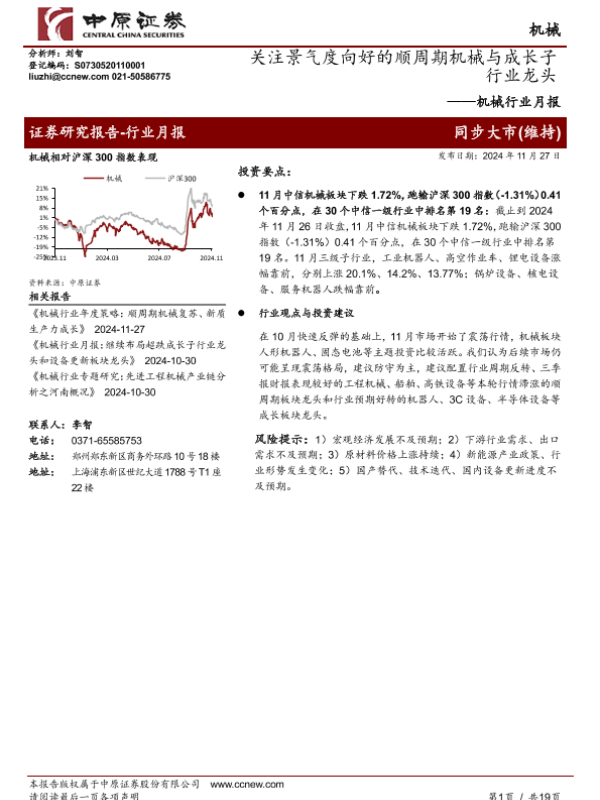 【中原证券】【20241127】20241127-中原证券-机械行业月报:关注景气度向好的顺周期机械与成长子行业龙头-19页 行业研究