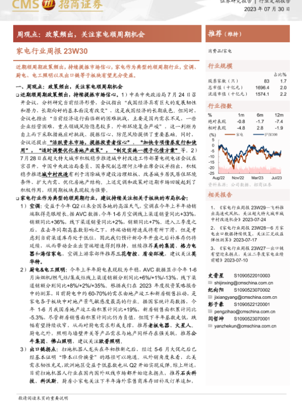 【海通证券】【20230730】20230730-招商证券-家电行业周报23W30:周观点:政策频出,关注家电顺周期机会-12页 行业研究