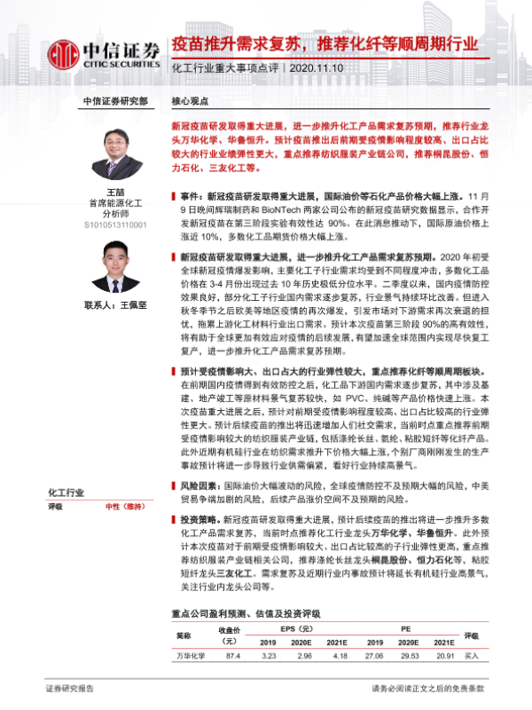 【中信证券】【20201110】20201110-中信证券-化工行业重大事项点评:疫苗推升需求复苏,推荐化纤等顺周期行业-3页 行业研究