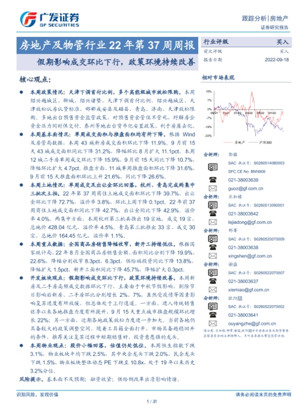 【广发证券】【20220918】房地产及物管行业22年第37周周报:假期影响成交环比下行,政策环境持续改善-31页 行业研究