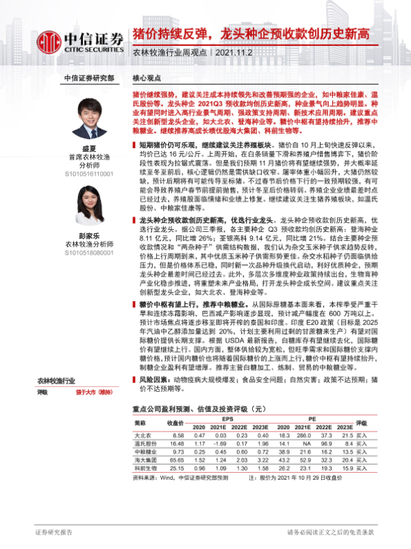 【中信证券】【20211102】20211102-中信证券-农林牧渔行业周观点:猪价持续反弹,龙头种企预收款创历史新高-11页 行业研究