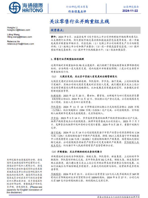 【海通国际】【20241122】商业贸易行业信息点评:关注零售行业并购重组主线-12页 行业研究