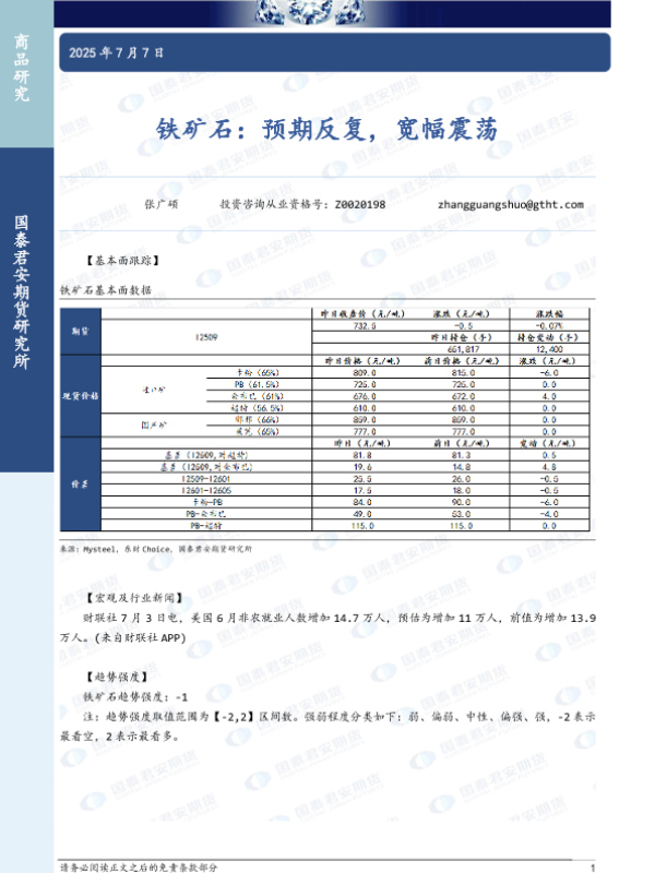 【国泰君安期货】【20250707】铁矿石:预期反复,宽幅震荡-2页 证券期货研究报告