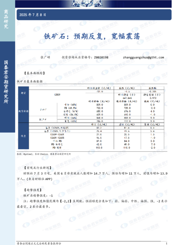 【国泰君安期货】【20250708】铁矿石:预期反复,宽幅震荡-2页 证券期货研究报告