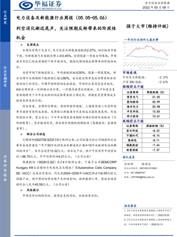 【华福证券】【20220508】电力设备及新能源行业周报:利空消化渐近尾声,关注预期反转带来的阶段性机会-7页 行业研究
