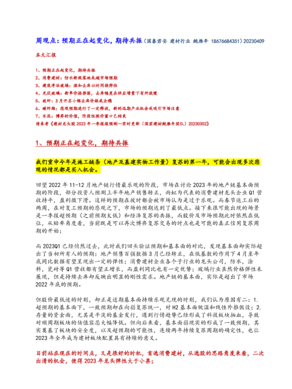 【国泰君安证券】【20230409】建材行业周观点:预期正在起变化,期待共振-16页 行业研究