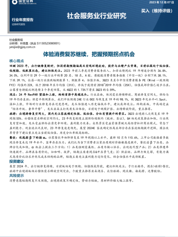 【国金证券】【20231207】社会服务业行业研究:体验消费复苏继续,把握预期拐点机会-23页 行业研究