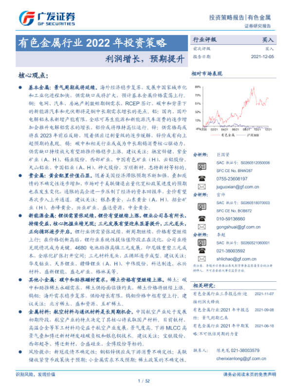 【广发证券】【20211205】有色金属行业2022年投资策略利润增长,预期提升-52页 行业研究