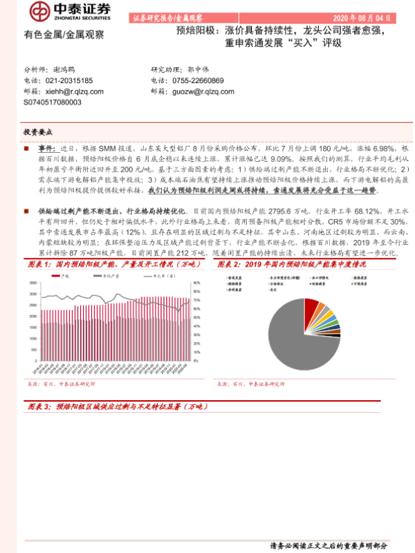 【中泰证券】【20200804】有色金属观察:预焙阳极:涨价具备持续性,龙头公司强者愈强,重申索通发展“买入”评级-5页 行业研究