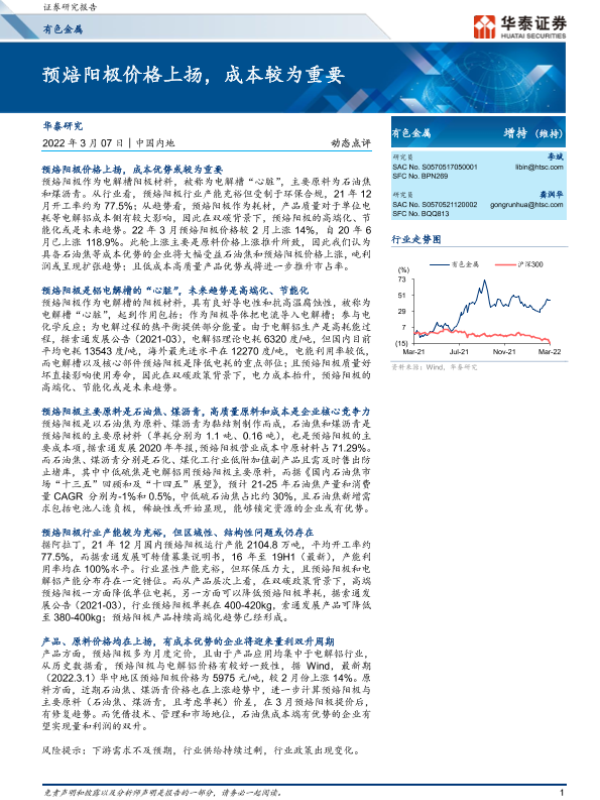 【华泰证券】【20220307】有色金属:预焙阳极价格上扬,成本较为重要-7页 行业研究