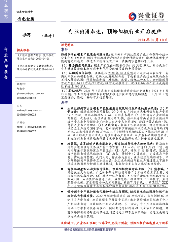 【兴业证券】【20200710】行业出清加速,预焙阳极行业开启洗牌-6页 行业研究