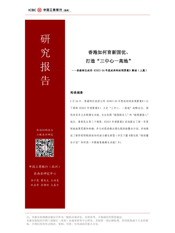 【中国工商银行(亚洲)东南亚研究中心】【20250403】香港如何育新固优、打造“三中心一高地”- 香港特区政府《2025-26年度政府财政预算案》解读报告(上)-20页 行业研究