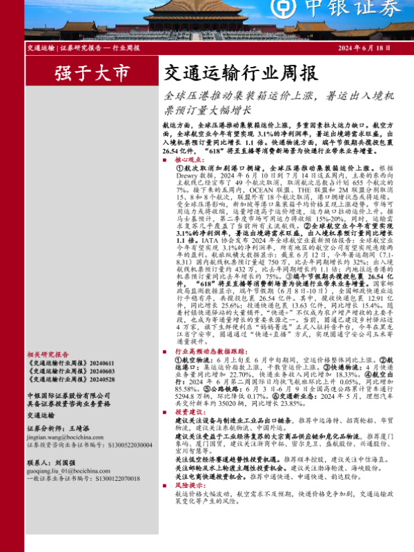 【中银证券】【20240618】交通运输行业周报:全球压港推动集装箱运价上涨,暑运出入境机票预订量大幅增长-26页 行业研究