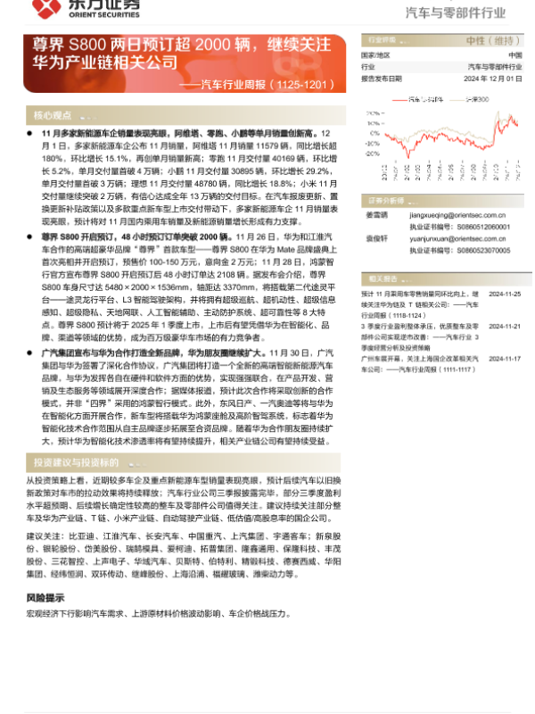 【东方证券】【20241201】20241201-东方证券-汽车行业周报:尊界S800两日预订超2000辆,继续关注华为产业链相关公司-17页 行业研究