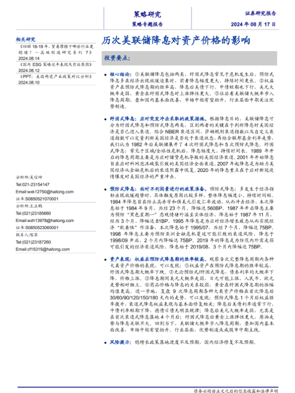 【海通证券】【20240817】历次美联储降息对资产价格的影响-15页 行业研究