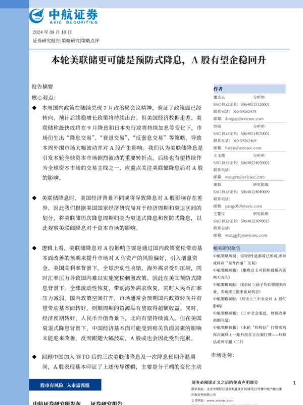 【中航证券】【20240810】本轮美联储更可能是预防式降息,A股有望企稳回升-12页 行业研究