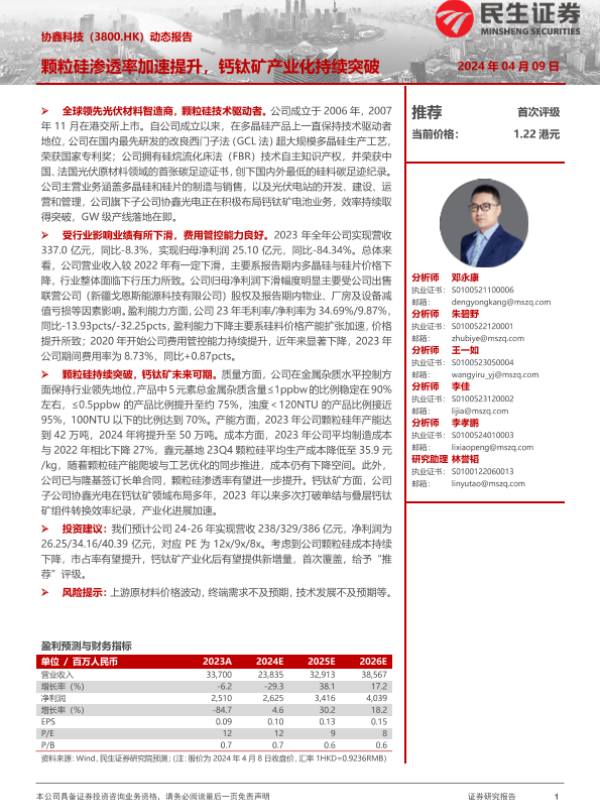 【民生证券】【20240409】协鑫科技(3800.HK)动态报告:颗粒硅渗透率加速提升,钙钛矿产业化持续突破-15页 行业研究