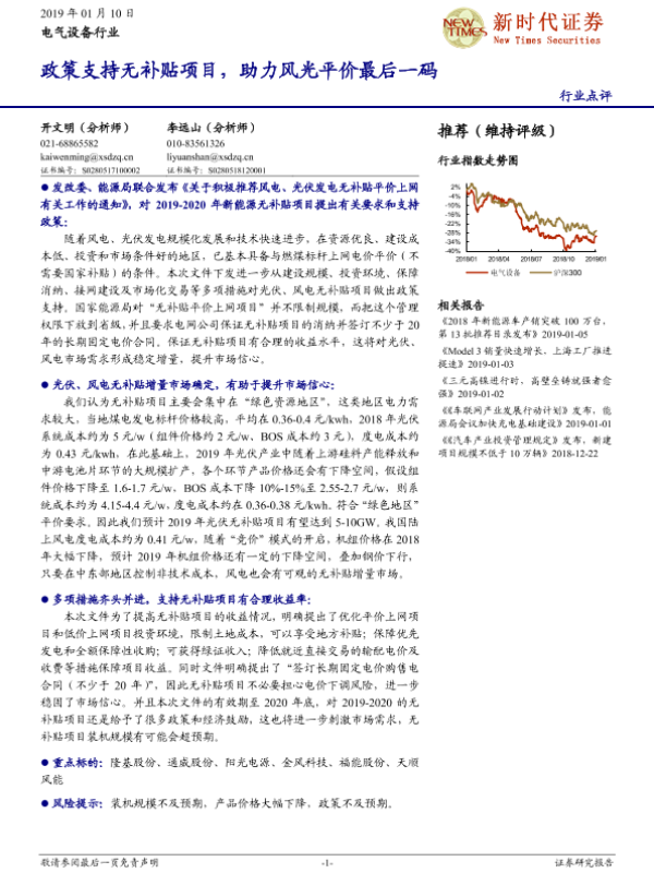 【新时代证券】【20190110】电气设备行业点评:政策支持无补贴项目,助力风光平价最后一码-3页 行业研究
