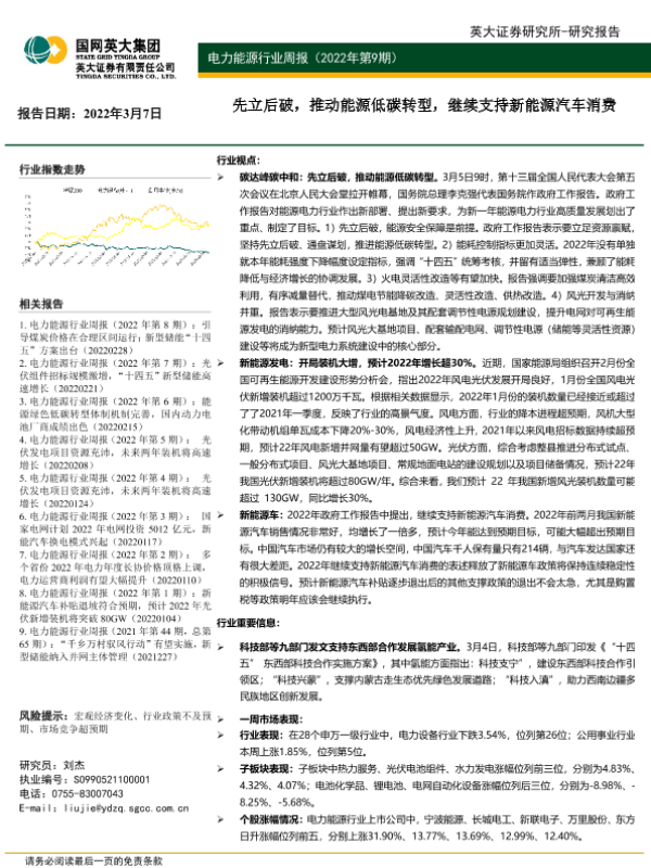 【英大证券】【20220307】20220307-英大证券-电力能源行业周报(2022年第9期):先立后破,推动能源低碳转型,继续支持新能源汽车消费-31页 行业研究