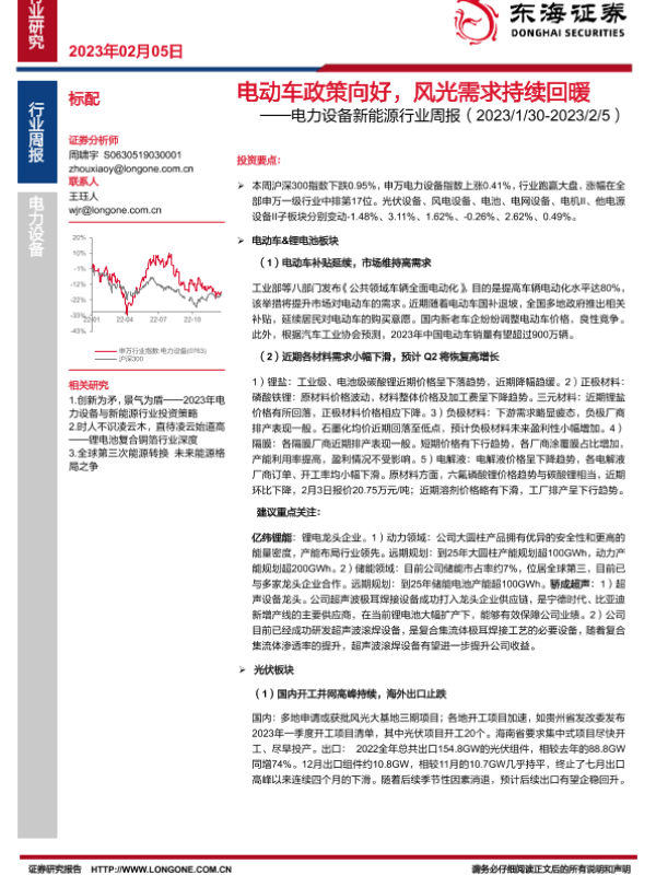【东海证券】【20230205】20230205-东海证券-电力设备新能源行业周报:电动车政策向好,风光需求持续回暖-31页 行业研究