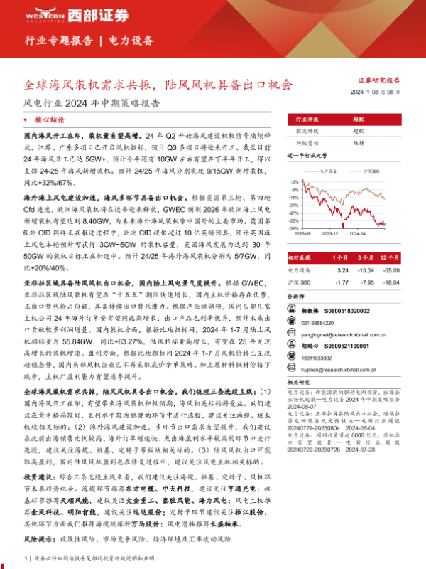 【西部证券】【20240808】风电行业2024年中期策略报告:全球海风装机需求共振陆风风机具备出口机会-30页 行业研究