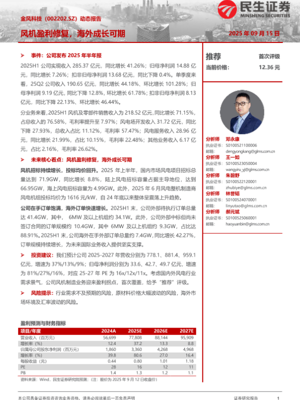 【民生证券】【202509】金风科技(002202.SZ)动态报告:风机盈利修复,海外成长可期-15页 证券期货研究报告