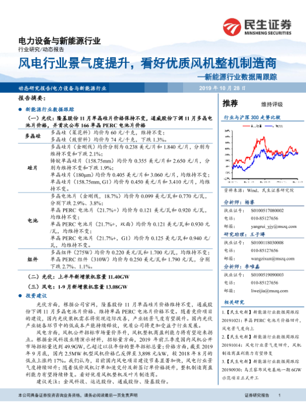 【民生证券】【20191028】20191028-民生证券-新能源行业数据周跟踪:风电行业景气度提升,看好优质风机整机制造商-11页 行业研究