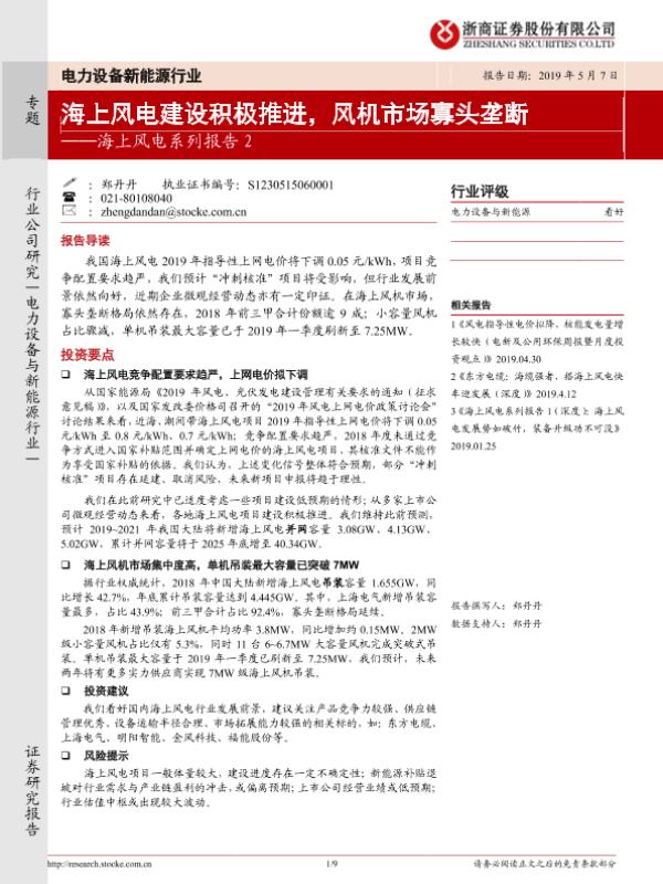【浙商证券】【20190507】海上风电建设积极推进,风机市场寡头垄断-9页 行业研究