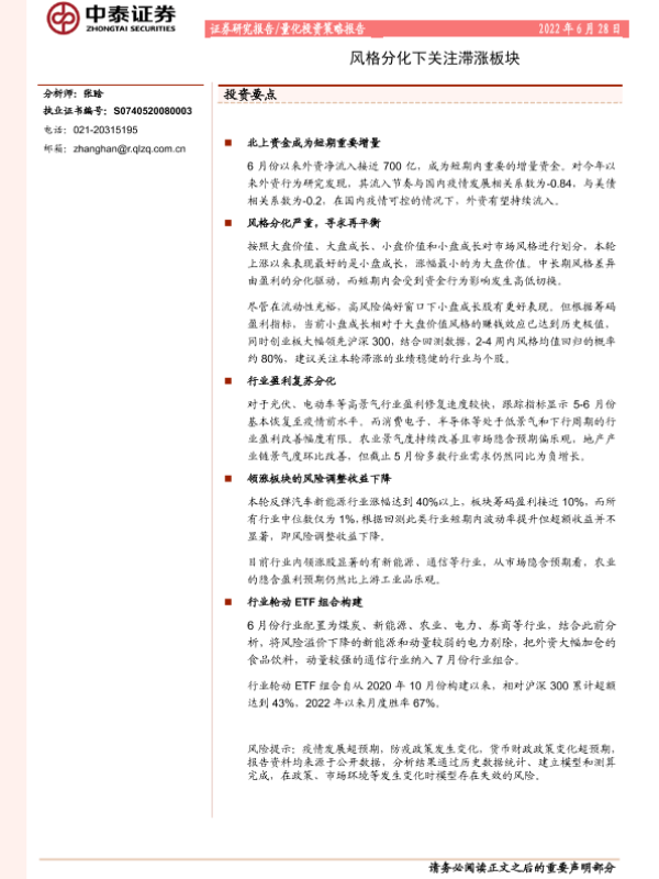 【中泰证券】【20220628】量化投资策略报告:风格分化下关注滞涨板块-20页 行业研究
