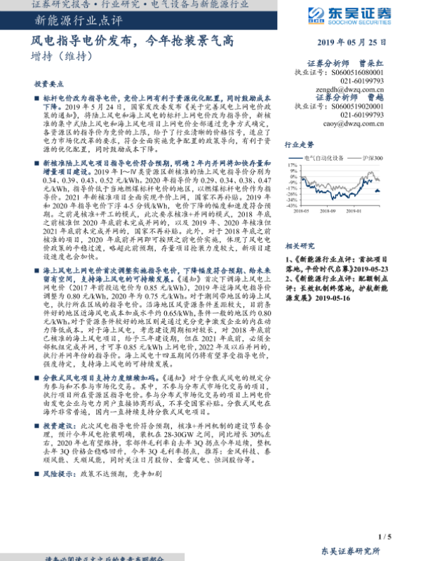 【东吴证券】【20190525】新能源行业点评:风电指导电价发布,今年抢装景气高-5页 行业研究