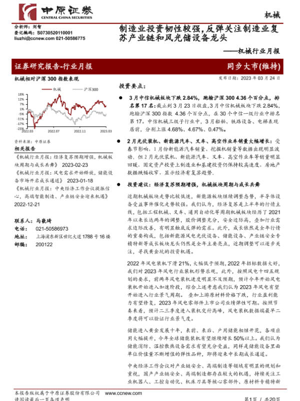【中原证券】【20230324】机械行业月报:制造业投资韧性较强,反弹关注制造业复苏产业链和风光储设备龙头-20页 行业研究
