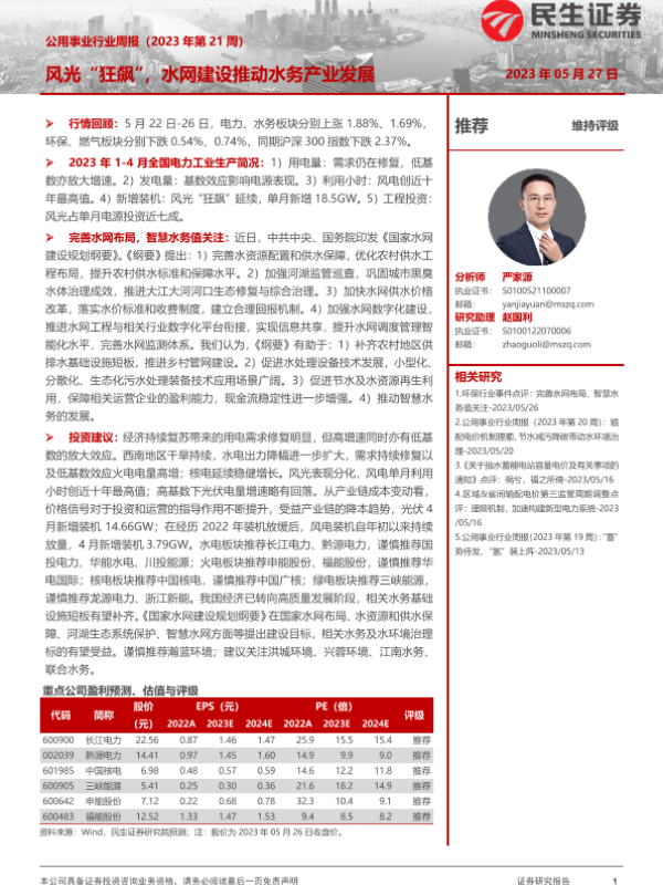 【民生证券】【20230527】公用事业行业周报:风光“狂飙”,水网建设推动水务产业发展-26页 行业研究
