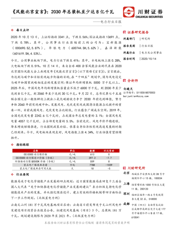 【川财证券】【20201014】电力行业日报:《风能北京宣言》:2030年总装机至少达8亿千瓦-3页 证券期货研究报告