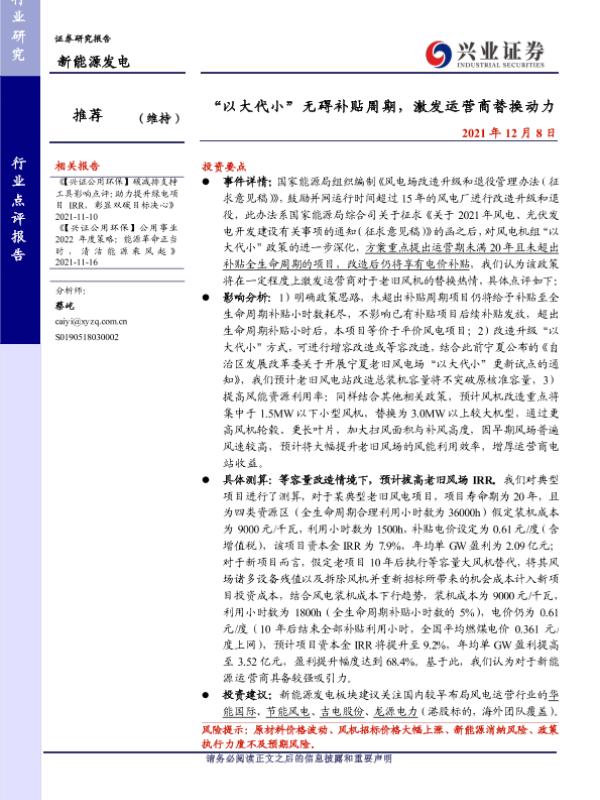 【中信证券】【20211210】公用环保行业重大事项点评:补贴不变且流程简化,老旧风场改造需求升温-3页 行业研究