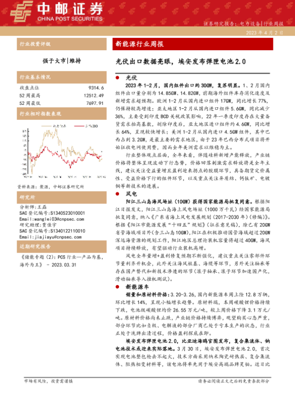 【中邮证券】【20230402】20230402-中邮证券-新能源行业周报:光伏出口数据亮眼,埃安发布弹匣电池2.0-19页 行业研究