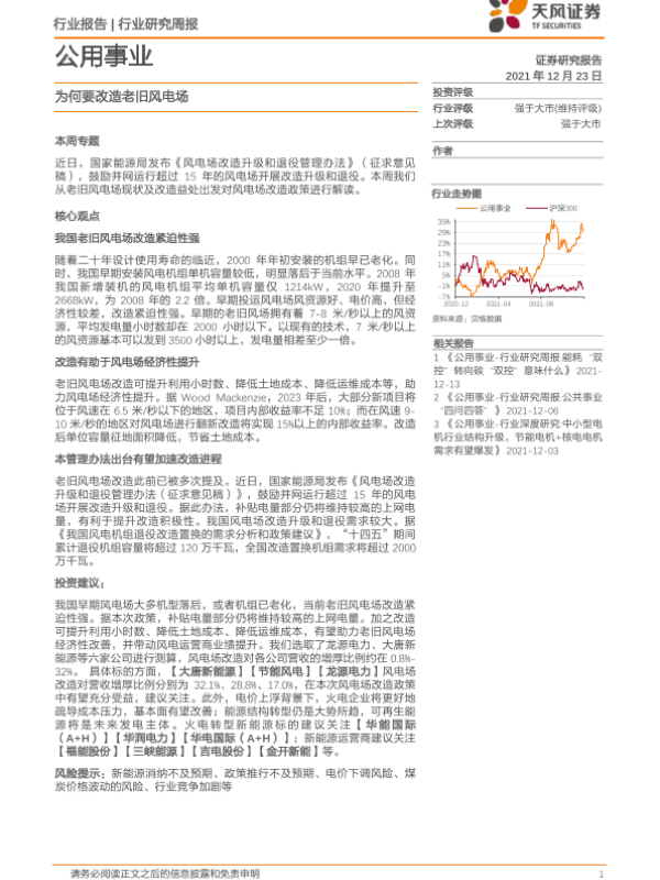 【天风证券】【20211223】公用事业行业研究周报:为何要改造老旧风电场-15页 行业研究
