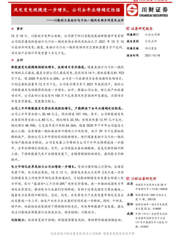 【川财证券】【20211018】川能动力美姑沙马乃托一期风电场并网发电点评-5页 证券期货研究报告