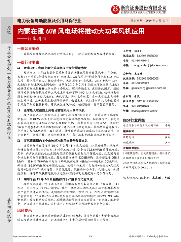 【浙商证券】【20190319】电力设备与新能源及公用环保行业周报:内蒙在建6GW风电场将推动大功率风机应用-4页 行业研究