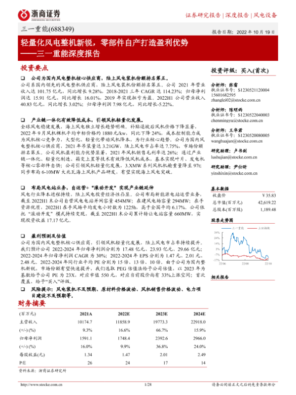 【浙商证券】【20221019】三一重能深度报告:轻量化风电整机新锐,零部件自产打造盈利优势-28页 行业研究