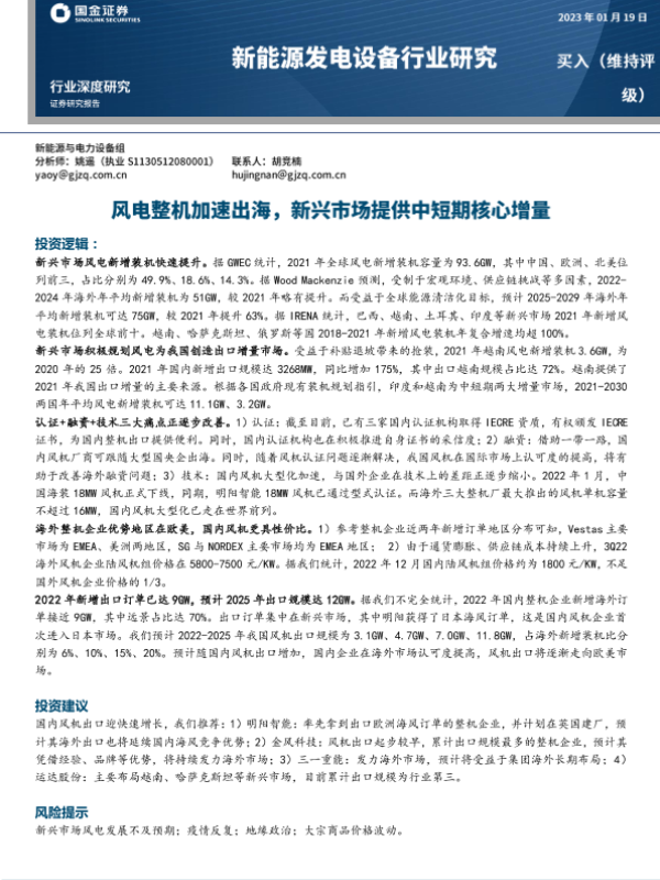 【国金证券】【20230120】2023年01月20日更新-【国金证券】新能源发电设备行业深度研究-风电整机加速出海-新兴市场提供中短期核心增量-18页 行业研究