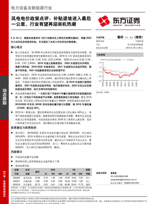 【东方证券】【20190526】电力设备及新能源行业动态跟踪:风电电价政策点评:补贴退坡进入最后一公里,行业有望再迎装机热潮-3页 行业研究