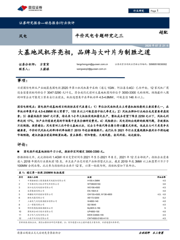 【国信证券】【20200721】平价风电专题研究之三:大基地风机齐亮相,品牌与大叶片为制胜之道-5页 行业研究