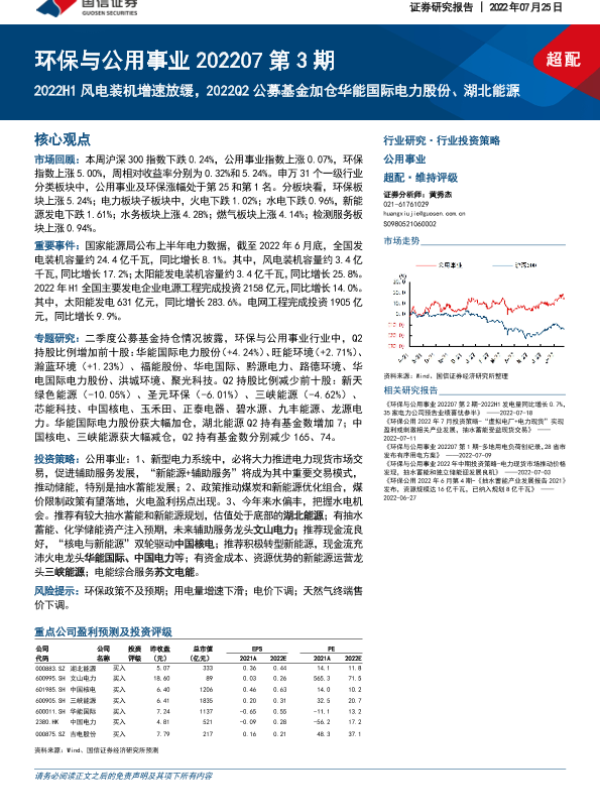 【国信证券】【20220725】2022H1风电装机增速放缓,2022Q2公募基金加仓华能国际电力股份、湖北能源-30页 行业研究