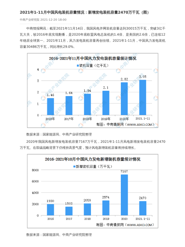 【中商产业研究院】【20211220】2021年1-11月中国风电装机容量情况:新增发电装机容量2470万千瓦-2页 行业研究